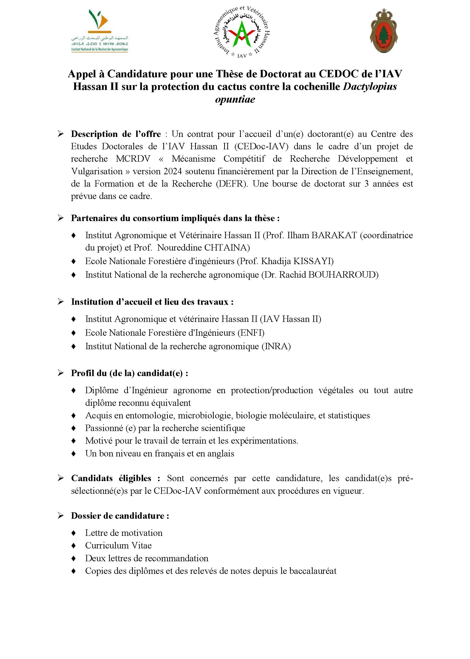 Appel à Candidature pour une Thèse de Doctorat au CEDOC de l’IAV Hassan II sur la protection du cactus contre la cochenille Dactylopius opuntiae